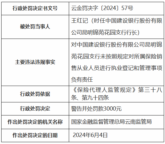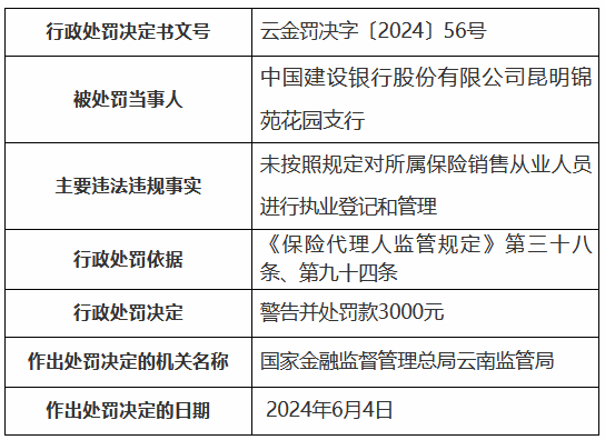 6月20日金融一线音书2024欧洲杯官网入口,中国缔造银行股份有限公司昆明锦苑花圃支行因未按照轨则对所属保障销售从业东谈主员进行捏业登记息争决,受到警戒并被罚金3000元。时任中国缔造银行股份有限公司昆明锦苑花圃支行行长王红记受到警戒并被罚金3000元。