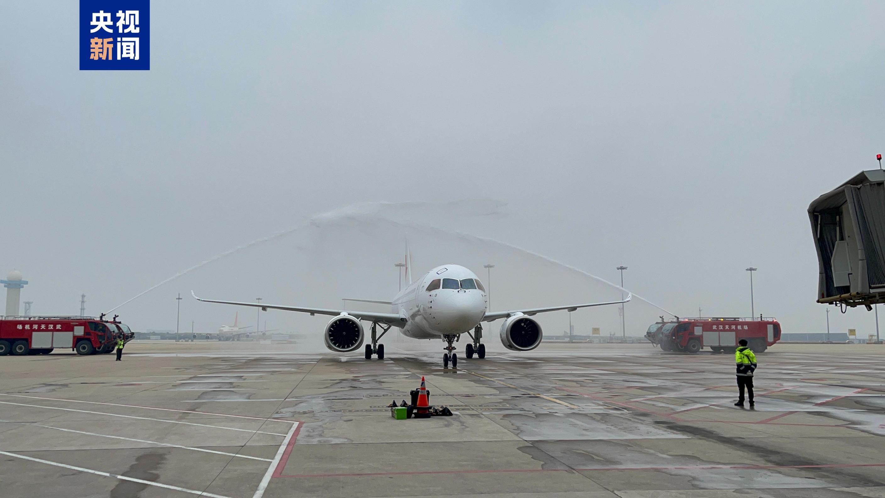 12月4日,C919国产大飞机又添“上海虹桥-武汉河汉”新航路。本日上昼11时08分,飞机编号为B-657T的东航第九架C919抓飞MU5385航班,从上海虹桥海外机场飞抵武汉河汉海外机场,并受到民航最高礼节“水门礼”的接待。