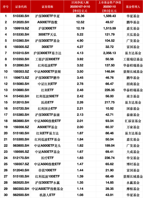 Wind数据暴露,1月6日至1月10日,沪深300ETF中原获资金净申购26.36亿元,鹏华A500ETF指数获资金净申购12.52亿元,嘉实沪深300ETF获资金净申购12.19亿元。一图看懂上周股票ETF净申购TOP30排名榜>>